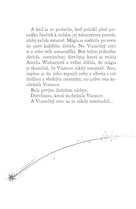 Amelia mala len štyri drobné priania. Tak dobre, tri malé a jedno veľké. A jediný, kto jej ich mohol splniť, bol Vianočný otec. No práve v roku, keď si ho najviac želala, neprišiel... Mohli za to nešťastní elfovia, nemohúce soby a nazúrení trolovia. Vianoce boli ohrozené! Vianočný otec vedel, že bez Amelie by najkrajší deň v roku už nikdy nenastal. A tak sa vybral za ňou, aby v nej oživil nádej a ona mohla zachrániť Vianoce.