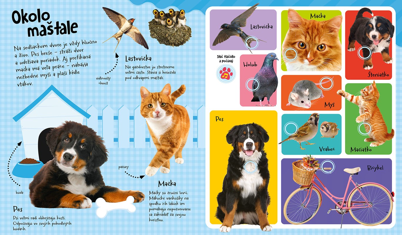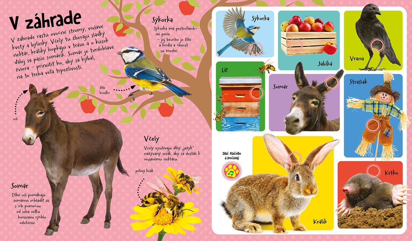 Táto krásna farebná zvuková knižka zoznámi malých čitateľov s farmou a jej obyvateľmi. Pri spoznávaní zvieratiek či farmárskych strojov a počúvaní zvukov, ktoré vydávajú, zažijú deti kopec zábavy! Stačí sa dotknúť ich obrázkov na stránkach knihy a tie ožijú!