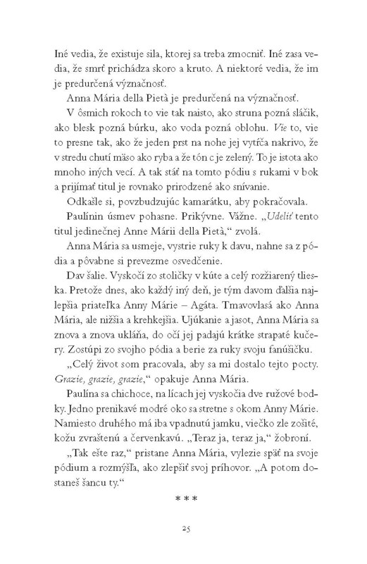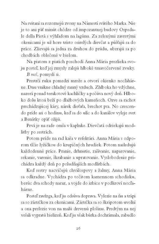 Román inšpirovaný skutočným príbehom Anny Márie della Pietá, benátskej siroty a husľového zázračného dieťaťa. Život poznala iba v Piete, sirotinci pre deti prostitútok. Napriek prísnym pravidlámi ich školili v speve a hudbe. Najtalentovanejšie mali šancu uniknúť osudu ostatných – vynútenému manželstvu. Anna Mária si predsavzala stať sa najlepšou huslistkou. Jej učiteľ Antonio Vivaldi rozpozná jej talent, učí ju všetko, čo vie sám, ale nie je to zadarmo...