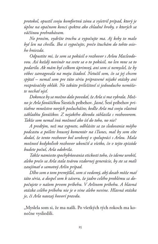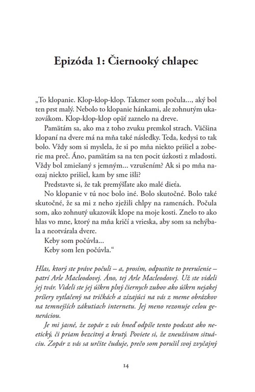 V jednu chladnú novembrovú noc v roku 2014, v malom meste na severozápade Anglicka, dvadsaťjedenročná Arla Macleodová kladivom ubila na smrť svoju matku, otca a mladšiu sestru. Teraz je uväznená v psychiatrickom ústave, odkiaľ poskytne exkluzívny rozhovor Scottovi Kingovi, investigatívnemu žurnalistovi, ktorého podcast Šesť príbehov sa stal internetovou senzá-ciou. Kinga úplne pohltí komplikovaný prípad, v rozhovoroch s piatimi svedkami a s Arlou sa snaží zistiť, či zníženie jej zodpovednosti za zločin bolo správne. Ako postupne rozpletá zamotané príbehy, spozoruje, že sám sa stal obeťou internetových trollov a vydierania. Ocitne sa vo svete zakázaných "hier" a záhadných čiernookých detí, ktorých existencia, zdá sa, ďaleko presahuje halucinácie vrahyne...