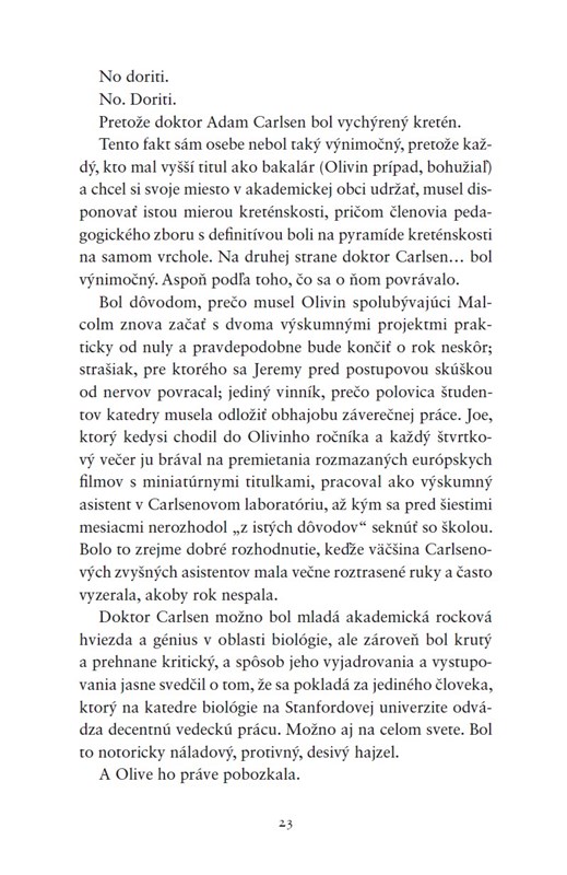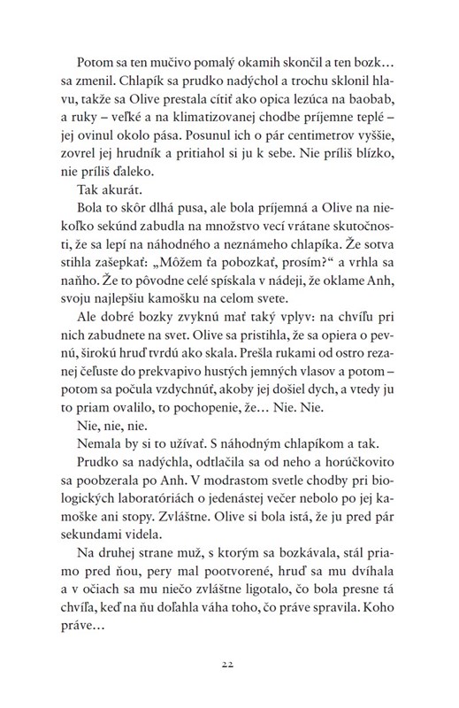 Keď falošný vzťah medzi vedcami narazí na nezadržateľnú silu príťažlivosti, starostlivo vypočítané teórie zachváti chaos… Olive Smithová, tretiačka na doktorandskom štúdiu, neverí na dlhotrvajúce romantické vzťahy. Ale jej najlepšia priateľka áno – a práve vďaka tomu sa dostane do tejto šlamastiky. Presvedčiť Anh, že skutočne randí, však nebude také jednoduché – vedci totiž potrebujú dôkaz. Preto, rovnako ako každá biologička s trochou sebaúcty, spanikári a pobozká prvého muža, ktorého zbadá. Ten muž nie je nikto iný ako Adam Carlsen, ich mladý a nadaný vyučujúci – a všeobecne známy kretén. Olive preto nedokáže uveriť vlastným ušiam, keď pristane na jej pretvárku a súhlasí, že bude vystupovať ako jej falošný priateľ. A keď sa veľká vedecká konferencia uberie nečakaným smerom a Olivina kariéra sa ocitne v ohrození, Adam ju prekvapí znova – pevnou podporou a ešte pevnejšou… vypracovanou hruďou! Ich malému experimentu odrazu hrozí poriadny výbuch. Olive si uvedomí, že jediná vec, ktorá je komplikovanejšia ako hypotéza lásky, je položiť vlastné srdce pod mikroskop.