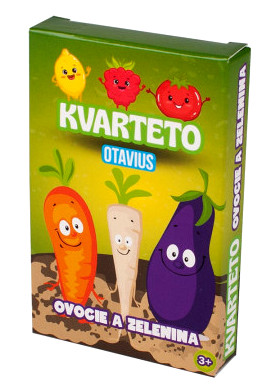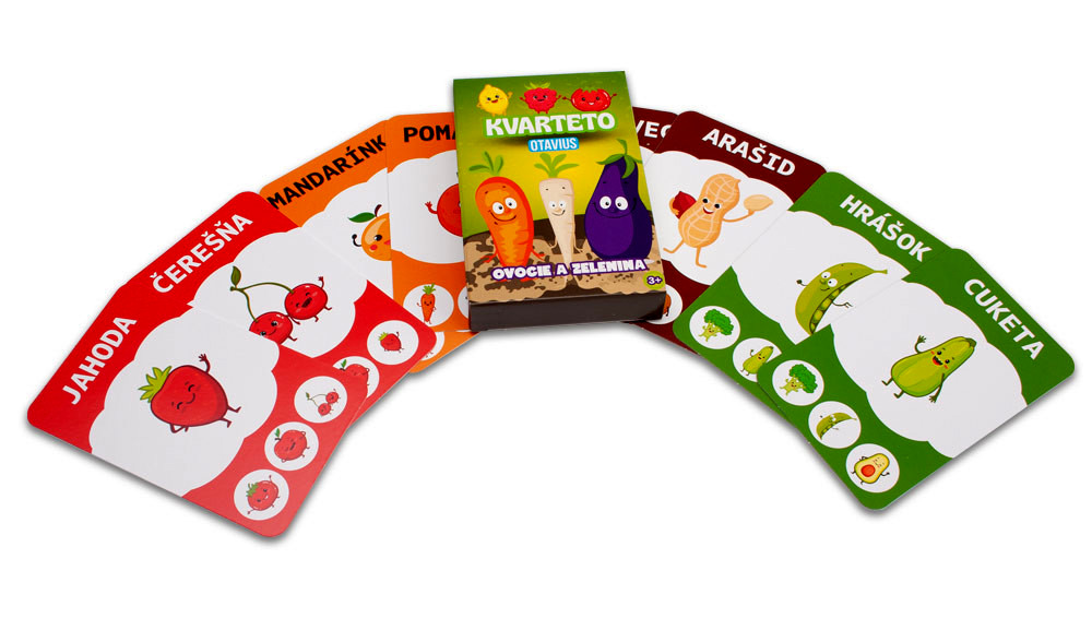 Kartová hra Kvarteto – Ovocie a zelenina spája učenie a zábavu do jednej jednoduchej, no nápaditej hry. Každú štvoricu tvoria štyri druhy ovocia alebo zeleniny rovnakej farby – napríklad červené jablko, jahoda, čerešne a paradajka. Hráči sa striedajú v pýtaní kariet a snažia sa nazbierať celé farebné kvarteto.