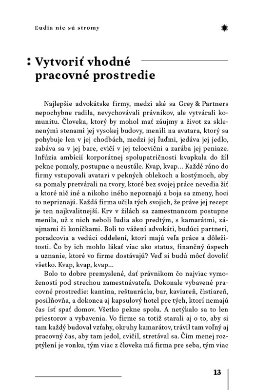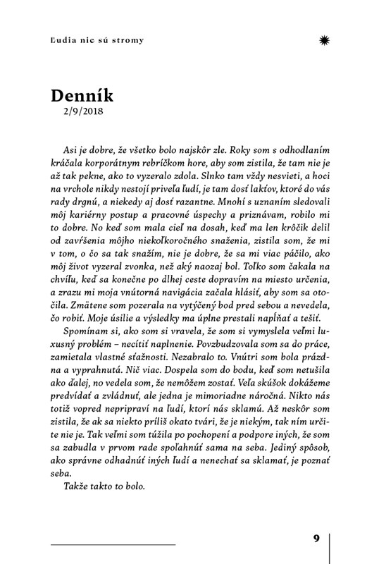 Po úspešnom debute Krásni ľudia prichádza Zuzana Šimeková so svojím druhým románom Ľudia nie sú stromy. Zostáva verná skúmaniu ľudského vnútra, krehkosti vzťahov, nástrahám modernej doby a hľadaniu vlastnej identity. Hlavná hrdinka Ema pracuje vo významnej londýnskej advokátskej kancelárii. Vysoké pracovné nároky sa výrazne podpisujú na jej schopnosti nadviazať a udržať zdravé vzťahy. Čakajú ju veľké životné zmeny: nová pracovná méta – partnerstvo vo firme – a zároveň návrat domov, do Bratislavy. V tomto náročnom období jej do života vstúpi Max – mladý muž, ktorý ju nesmierne obdivuje. Spočiatku nevinný vzťah vo virtuálnej realite naberá na intenzite. Dokáže sa Ema presadiť medzi mužskými kolegami a ustáť hry firemnej internej politiky? Nájde v sebe silu vymaniť sa zo škodlivého prostredia a spod vplyvu ľudí, s ktorými sa necíti dobre?