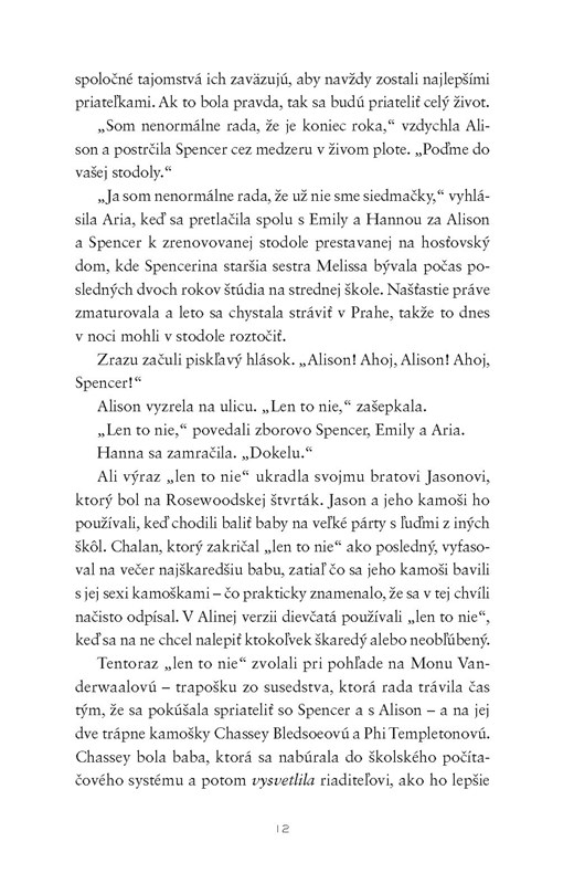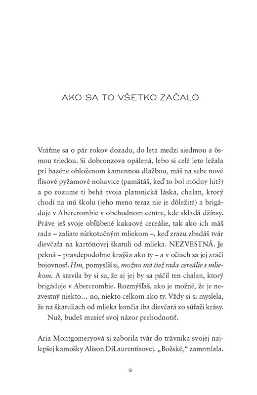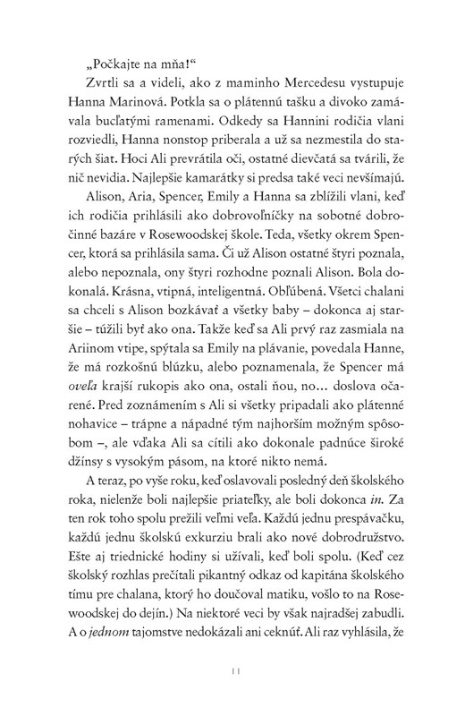 Spencer prahne po priateľovi svojej sestry. Aria sa zapletie s učiteľom angličtiny. Emily premýšľa, prečo radšej trávi čas s novou babou ako s vlastným frajerom. A Hanna spraví čokoľvek, aby zostala krásna. Všetky spolu však skrývajú tajomstvo temnejšie, než si dokážete predstaviť. Odkedy zmizla ich kamoška Alison, vydýchli si. No minulosť ich dobieha. Ako to viem? Pretože ja viem všetko – aké zlé tieto baby boli, aké nemravné sú teraz a aké špinavé tajomstvá skrývajú. A hádajte čo? Všetkým to poviem. A.