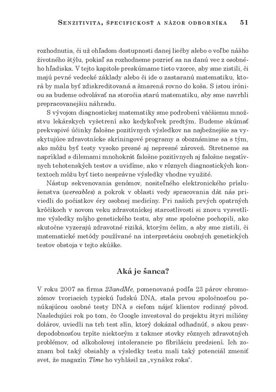 Matematické vzorce formujú ľudské životy – od pôrodnosti cez choroby až po to, ako vnímame plynutie času. V tejto mimoriadne zrozumiteľne sformulovanej knihe nás Kit Yates vyzbrojuje jednoduchými matematickými pravidlami a nástrojmi, ktoré nám môžu pomôcť porozumieť chaotickým a často nejasným hádankám nášho sveta. Odhalíte, ako nám matematika môže zmeniť život k lepšiemu, ako sa vyvarovať omylov alebo ako čítať správy a odhaľovať lži.
