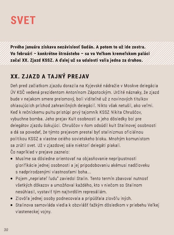 Búrlivé zvraty v politike, strach z ďalšej vojny, povodne, ale aj rozmach priemyslu a rast životnej úrovne, prebúdzanie sa kultúry. O roku 1956 rozhodne nemôžeme povedať, že bol nudný. Práve naopak. Nikita Chruščov na XX. Zjazde KSSZ definitívne pochoval stalinizmus. Životná úroveň pomaly rastie... Dediny ale straší kolektivizácia. Kultúrne prostredie sa postupne uvoľňuje a pripravuje pôdu na väčšie zmeny v nasledujúcom desaťročí.