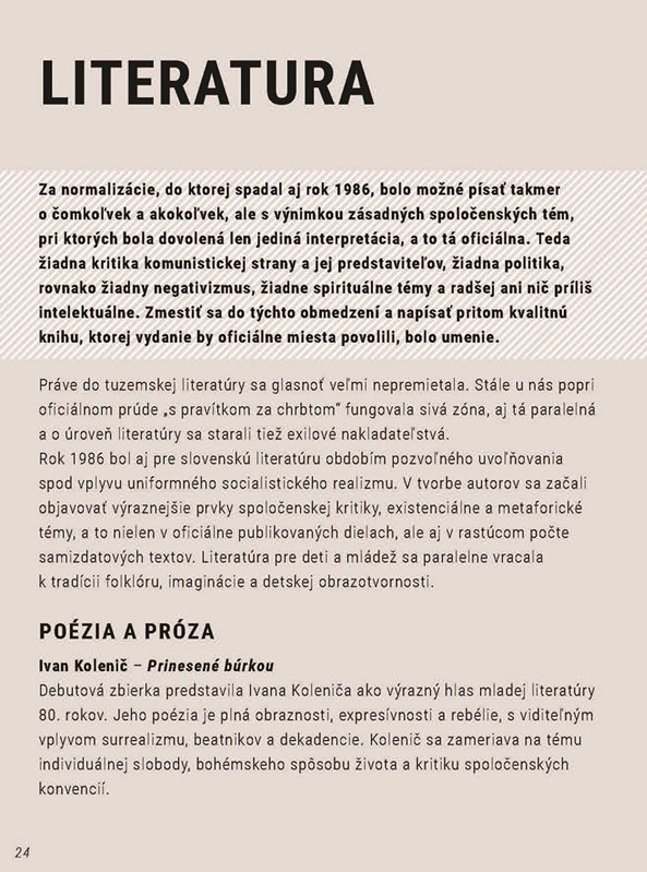 Vo vzduchu už cítiť blížiacu sa zmenu. Sloboda nenápadne klope na dvere, je ju ale ešte skôr cítiť, než vidieť. Nádej už mala aj tvár aj meno: Michail Gorbačov. A do toho najväčšia katastrofa posledných desaťročí. Výbuch v Černobyľskej jadrovej elektrárni. Závan nových čias je azda najviac cítiť v kultúre. Na Slovensku vznikajú dodnes v mnohom neprekonané hudobné diela - Po schodoch či Tlaková níž od Richarda Müllera a Banketu či Tanečnice z Lúčnice a Kráľovná bielych tenisiek od Elánu.
