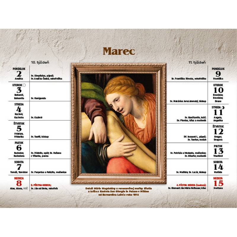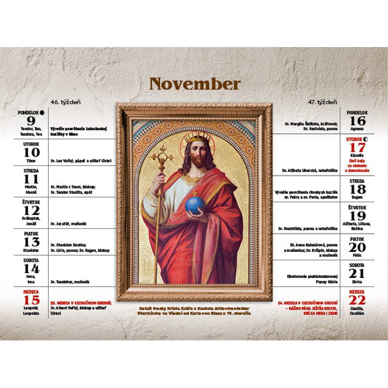 Stolový dvojtýždňový kalendár s náboženskou tematikou zachytenou na krásnych maľbách, mozaikách, reliéfoch a freskách, od slávnych i neznámych autorov, s popisom zobrazenia. Obsahuje bohaté cirkevné a svetské kalendárium. Nechýbajú slovenské mená a štátne sviatky.