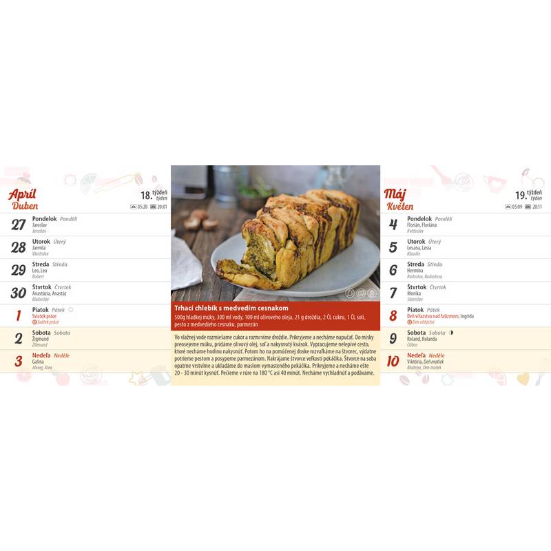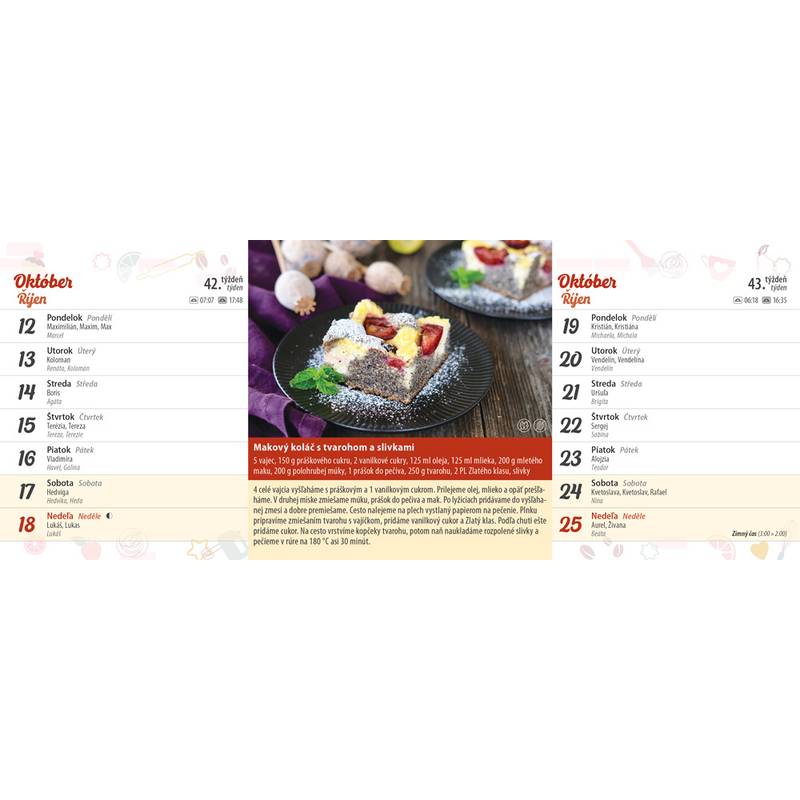 Za každým dobrým obedom by mal nasledovať dezert, hovoria naše staré mamy. Výber najlepších a nenáročných sladkých i slaných koláčikov vám ponúka dvojtýždňový stolový kalendár s receptami a informáciami pre alergikov. V riadkovom kalendári nájdete slovenské a české mená, sviatky oboch krajín a východy a západy Slnka.